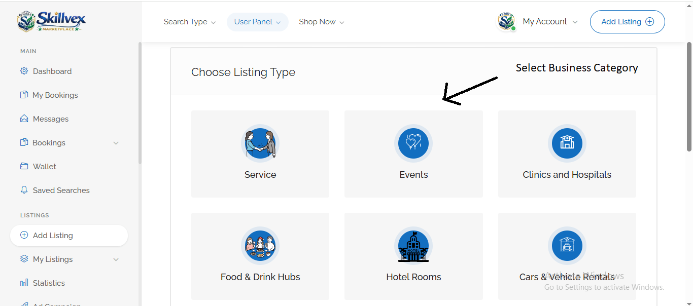 Step 2:- Upon clicking the “Add Listing” button, you will see several main business categories. Now, select the main category for your business—such as Hotel Rooms, Services, Cars & Vehicle Rentals, Clinics & Hospitals, or Home-Based Services. As soon as you select your business’s main category, sub-options tailored to that specific category will begin to appear.