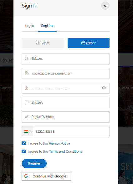 Go to Skillvex.com, click “Sign In,” button. Then navigate to the Registration tab and select the option that suits your needs—either “Guest” or “Owner.” Enter your details, including your mobile number, and then enter the 4-digit OTP you receive. Your account will be created instantly. Click for more information. 👉 Click here